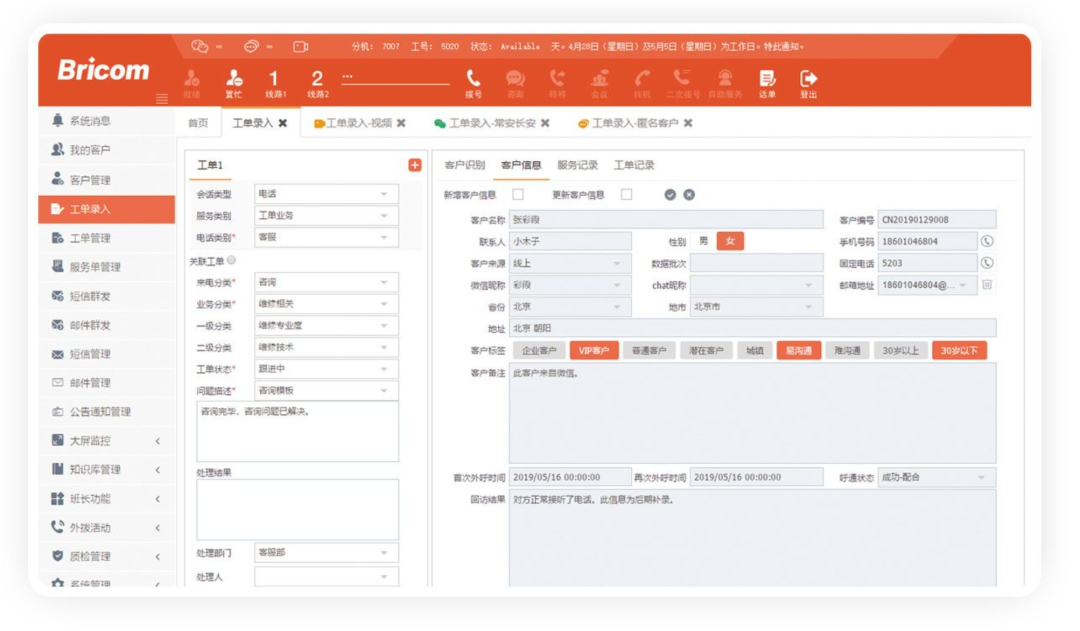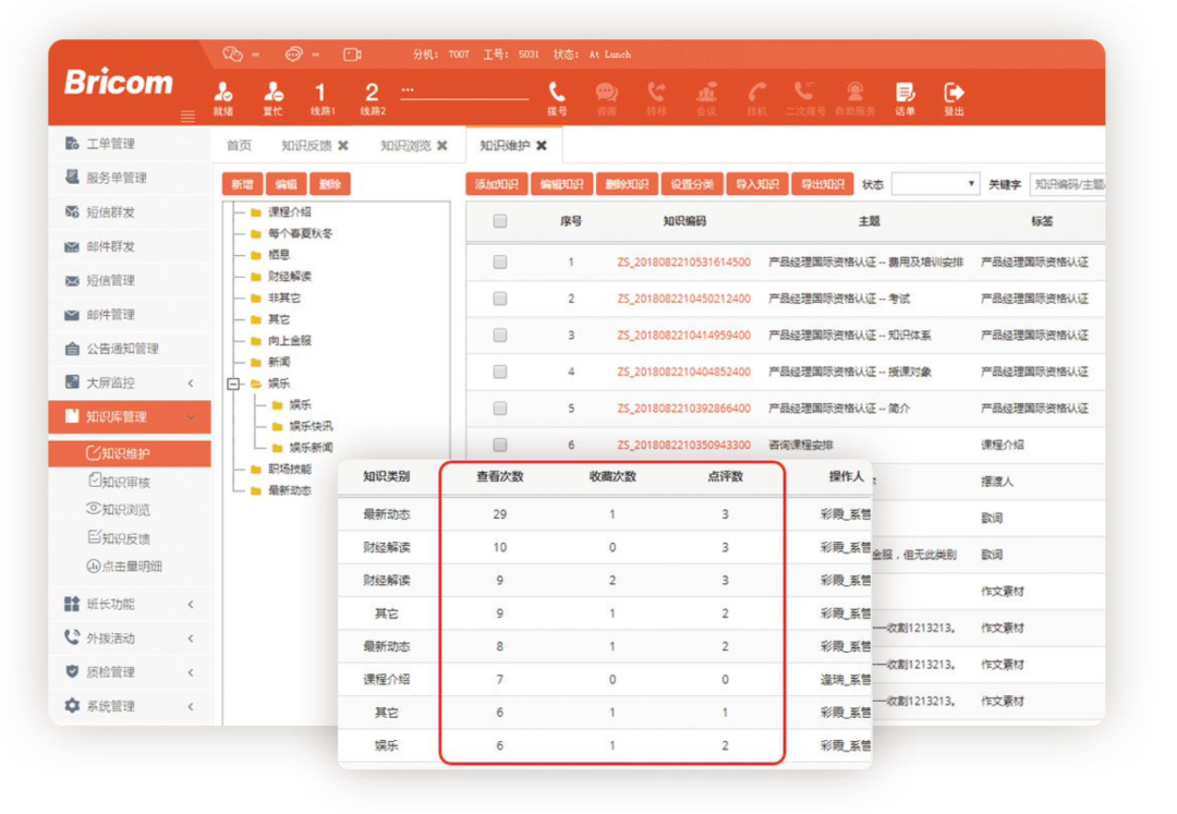 支持全渠道接入,提供智能IVR业务分流、来电弹屏、知识库管理等功能,对客户咨询建立起一套有效疏导,及时反馈,事后总结的管理机制。