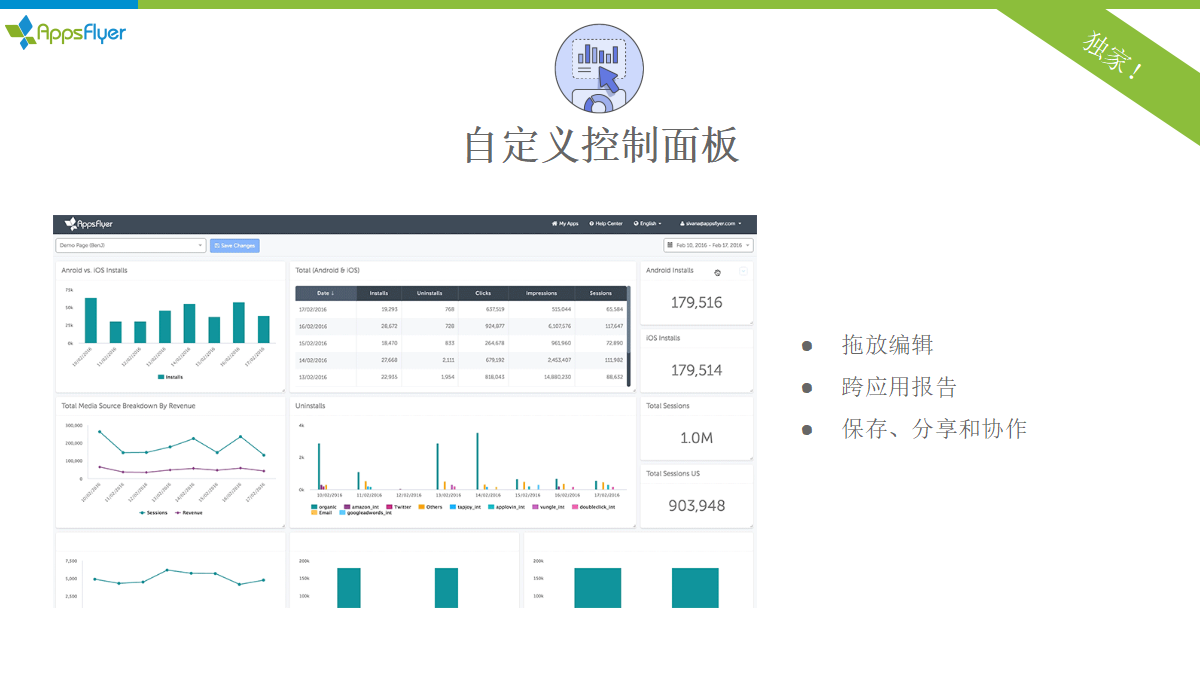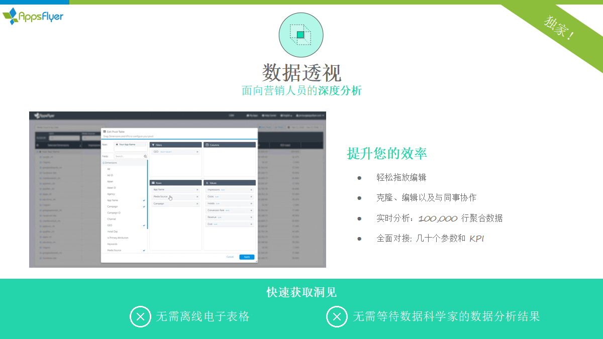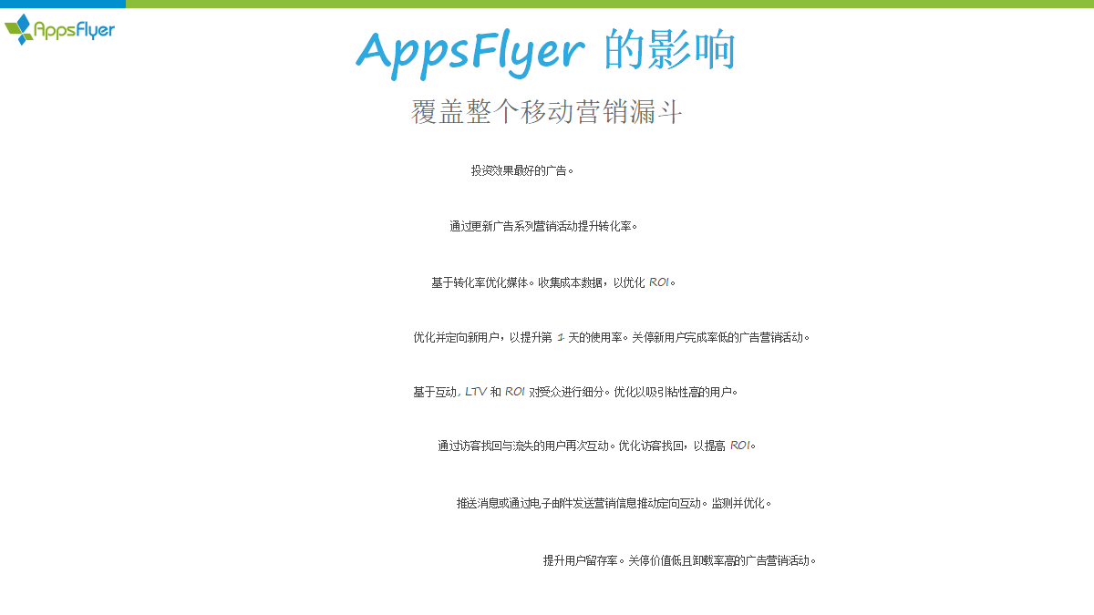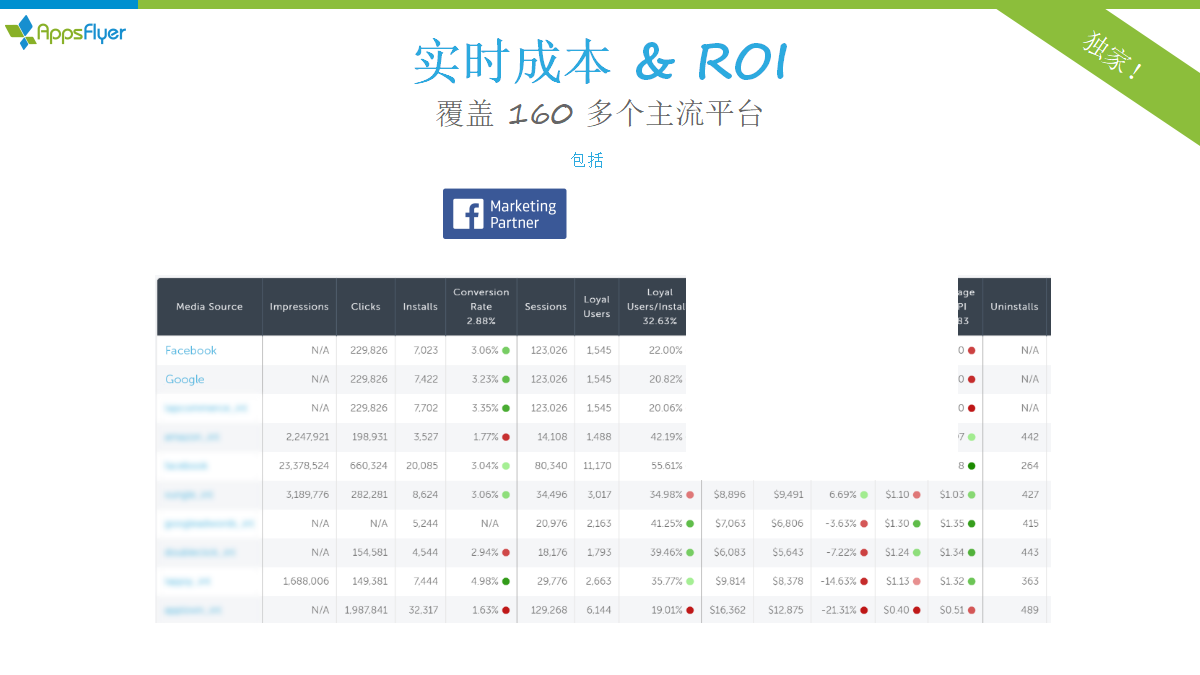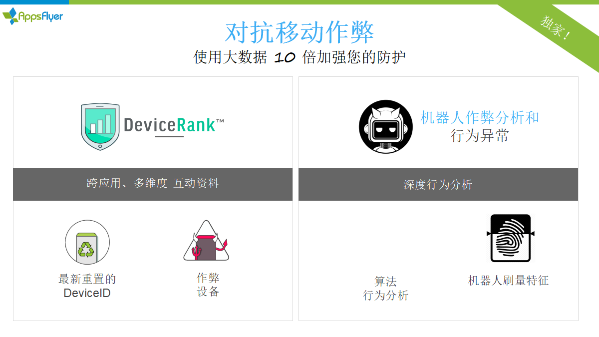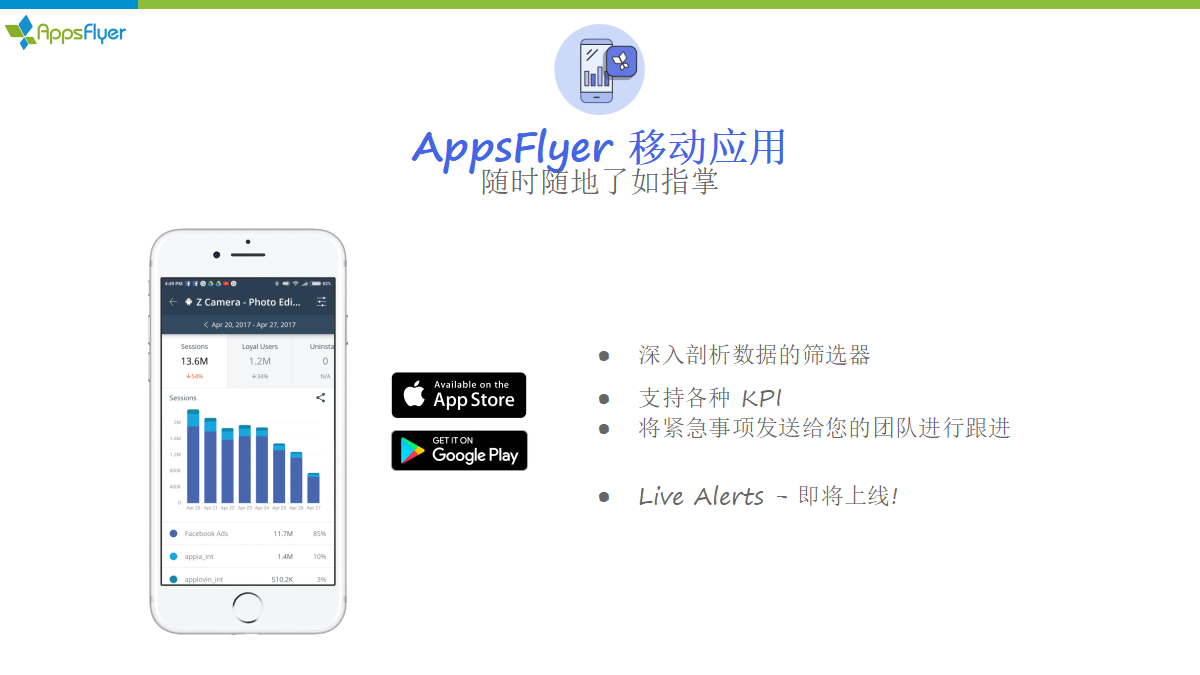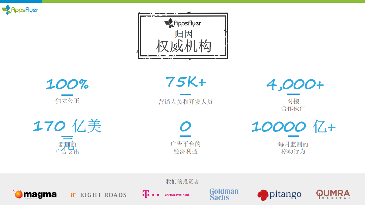 AppsFlyer 秉承客户至上的服务理念和专注产品的专业精神。全球超过 12000 多家企业选择 AppsFlyer 的移动归因与营销分析服务。企业客户选择 AppsFlyer 移动归因,AppsFlyer 月度监测上万亿移动事件,基于独一无二的数据规模、行业前沿的机器学习技术,AppsFlyer 开发了全行业最精确的移动归因、营销分析与作弊防护解决方案。