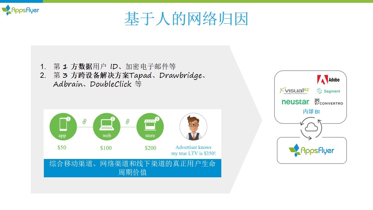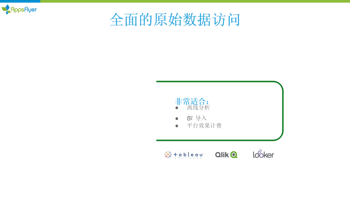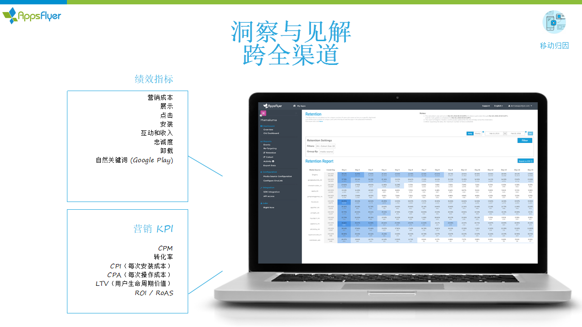 将 AppsFlyer 营销分析与 BI 系统、客户数据库同步,实时评估全渠道的营销动态。