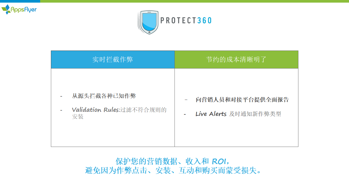 2018 年移动作弊侵蚀广告预算总计达 190 亿美元,此时作弊技术正以令人咋舌的速度层出不穷。AppsFlyer 独一无二的数据规模、机器学习和行为分析,造就了业内最前沿的防作弊解决方案,每天帮助广告主保护上万美元的广告预算。