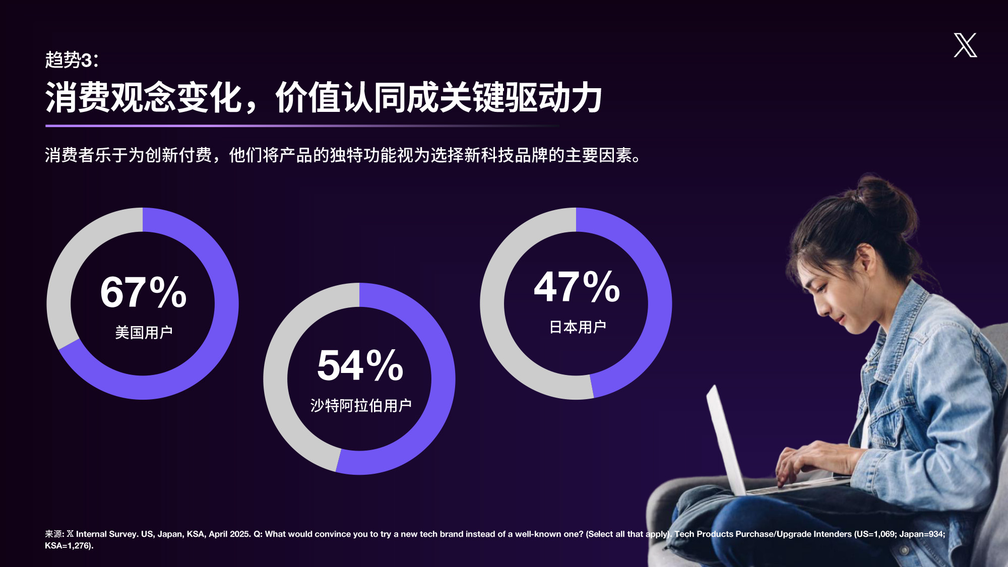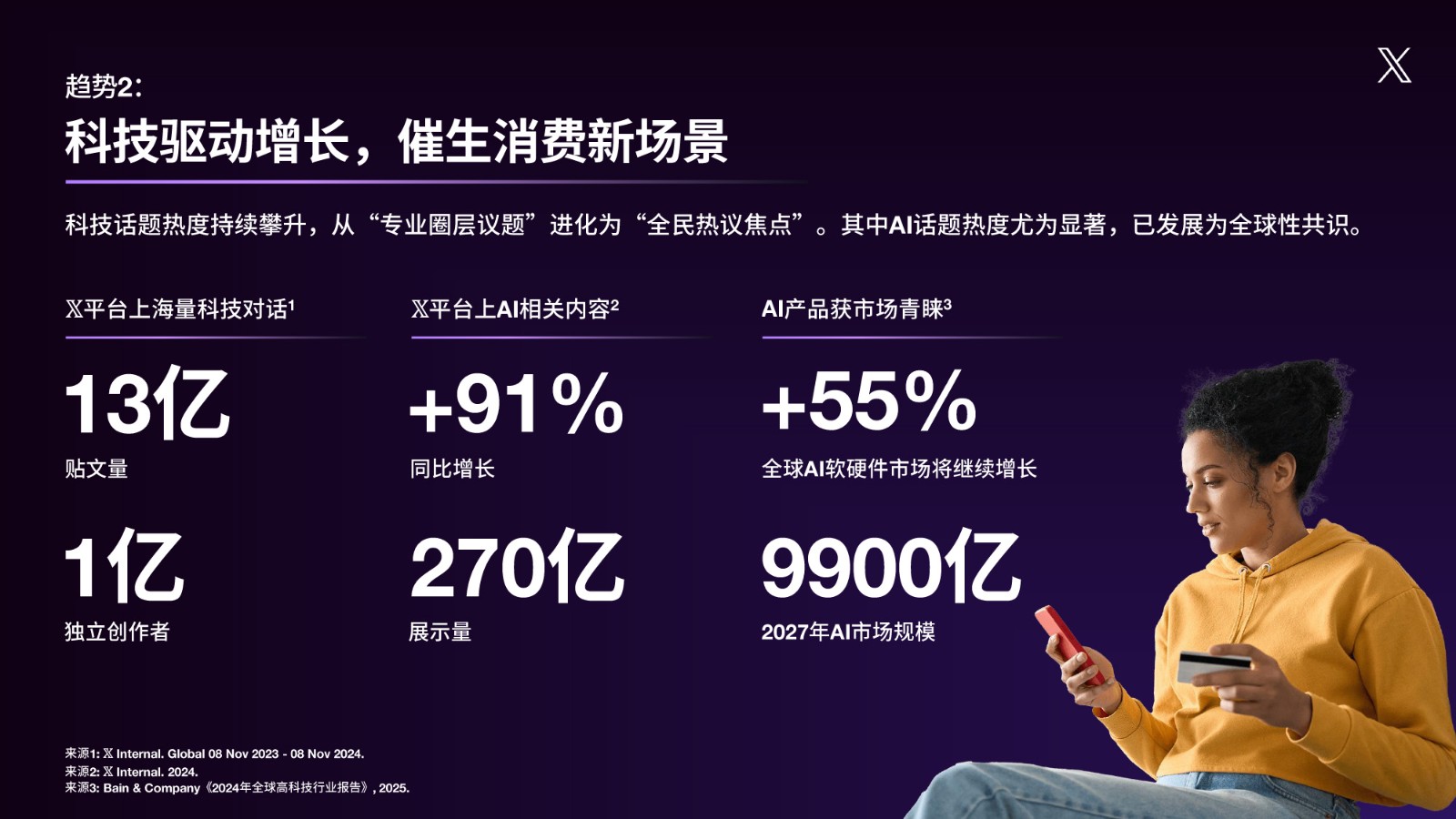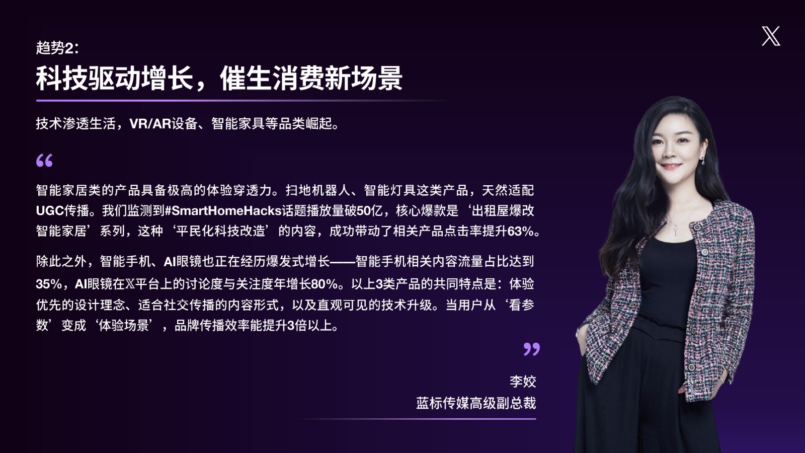 X平台数据显示,AI相关内容热度显著,全球AI市场规模预计持续增长。智能家居、智能手机、AI眼镜等品类崛起,消费者更关注体验和社交传播。可持续发展成为消费关键驱动力,科技品牌可借势推广环保理念。