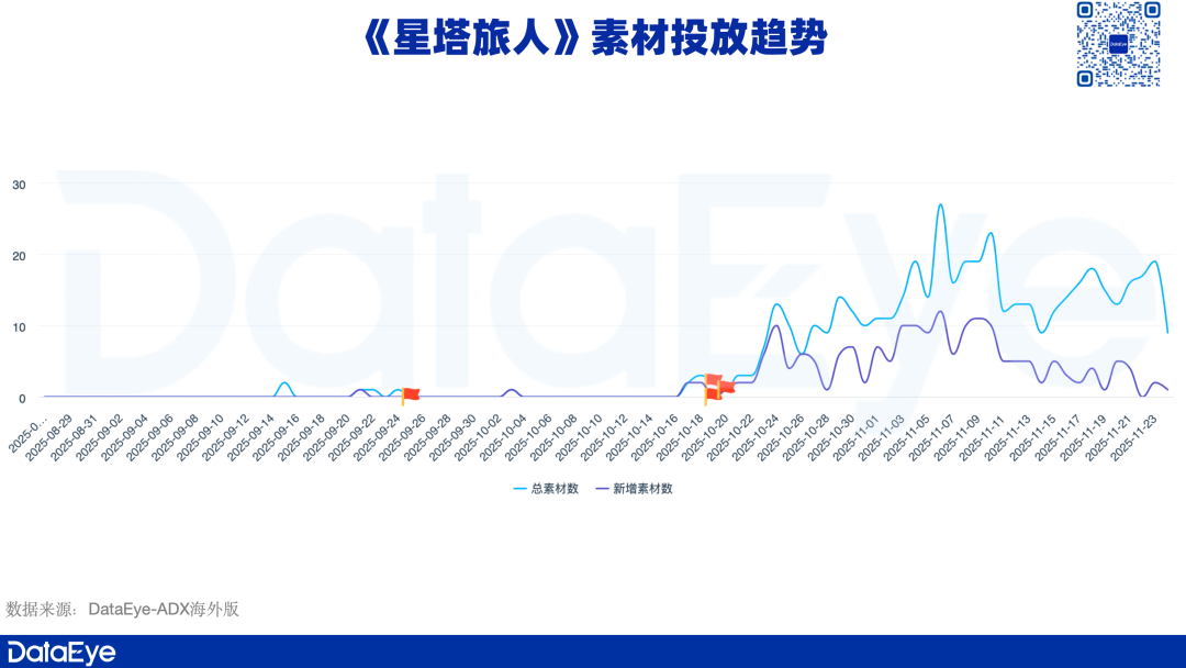 从《星塔旅人》素材投放趋势可以看出,其在10月下旬开始进行素材投放,但整体素材投放量并不突出。