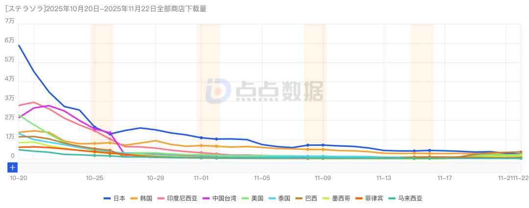 点点数据显示,截至11月22日《星塔旅人》双端平台累计下载量约达173万。其中日本市场占比约为24.47%。